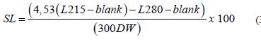 Where: DW=dry sawdust weight, and DWlig=dry weight of insoluble lignin. Soluble lignin (SL) filtrates and the blank were read at two wavelengths (215 nm and 280 nm), respectively, using quartz cuvettes.