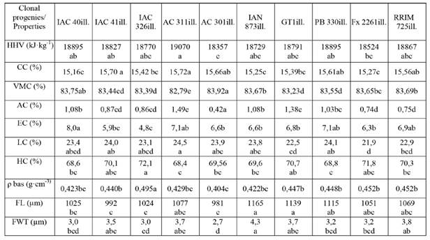 The values of energy and chemical characteristics, wood density and wood fiber of rubber tree clonal progenies showed different behaviors. Progenies IAC 311ill., PB 330ill., IAC 41ill., IAC 301ill., and IAN 873ill. presented higher lignin and fixed carbon levels that contributed to HHV (Table 2), thus presenting superior energy performance compared to other clones. According to Trugilho and Silva (2001), these differences in energy properties can be associated with chemical composition that can affect the energy characteristics of biomass.