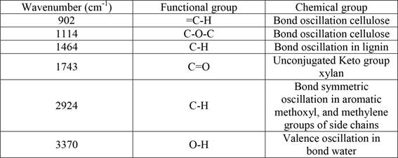 According to Figure 1, the group found at 1743 cm-1 can be attributed to C=O, indicating the presence of an acetyl or carboxylic acid group derived from lignin. The high proportion of these chemical groups indicates an increase in HHV (Table 1). The same behavior was reported by Schuerch (1989).