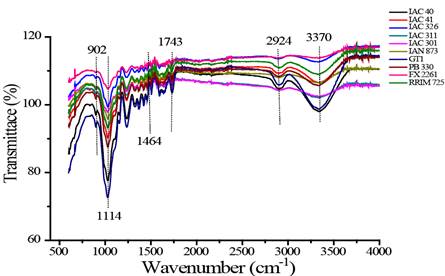 One can observe that all clones have a strong absorption band at 1114 cm-1 where the lignin present in wood is located (Schuerch 1989). However, clones IAC 40, GT1, PB 330, IAC 41, RRIM 725, and IAN 873 had higher wavelengths in this spectrum. This could be explained by the chemical structure of wood because these clones have higher levels of lignin (Table 2) and, hence, higher resistance to thermal degradation of the material, as characterized by the stretch mode of the O-H combination.