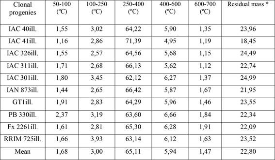 Table 4 shows averages of mass loss of different clonal progenies of Hevea brasiliensis, as a function of temperature ranges from 50 ºC to 700 ºC.