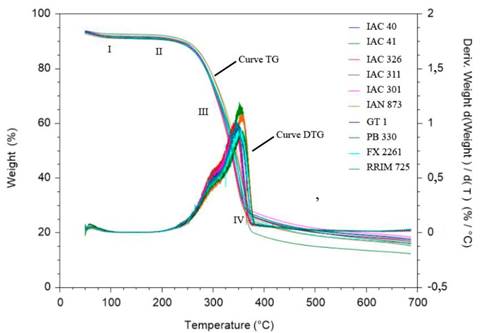 The first two temperature ranges, 50 ºC - 100 ºC and 100 ºC - 250 ºC, correspond to drying of wood (Vieira 2019), making an average total of 4,68 % of initial average total loss for clonal progenies of Hevea brasiliensis.