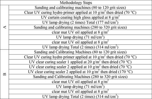 Two different applications were made in accordance with the described in Table 1 in a parquet flooring company named KPS (Düzce City, Türkiye). Both applications started with a clear UV curing hydro-primer (Kneho-Lacke GmbH, Horn-Bad Meinberg, Germany) (T8028-0000) containing polyurethane acrylate and unsaturated acrylate resins dispersed in water. Then in method A, a high gloss coating (Kneho-Lacke GmbH, Horn-Bad Meinberg, Germany) (T9120-0900N1) containing glycerol and propoxylated esters with acrylic acid. In method B two different sealers, clear sealer 1 (Kneho-Lacke GmbH, Horn-Bad Meinberg, Germany) (T9110-0000H) and clear sealer 2 (Kneho-Lacke GmbH, Horn-Bad Meinberg, Germany) (T9110-0000) were used. Both methods ended with an oil clear mat for roller coating with UV curing (Kneho-Lacke GmbH, Horn-Bad Meinberg, Germany) (T9115-0000) More permonorized information about the chemicals of the different layers used in this study are presented elsewhere (Ayata 2019).