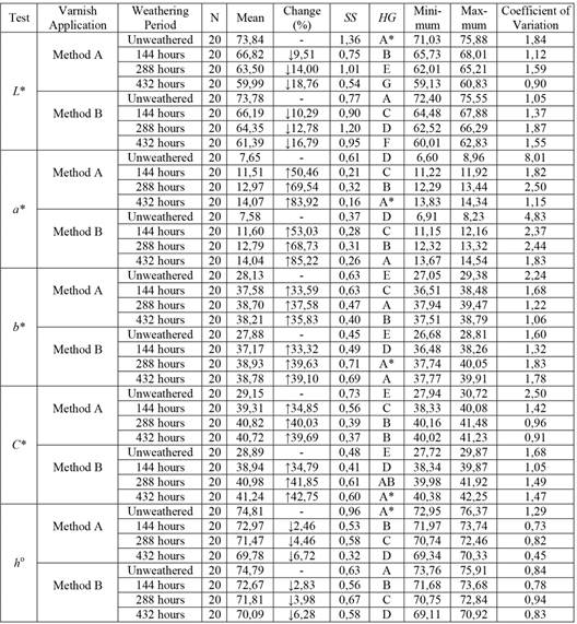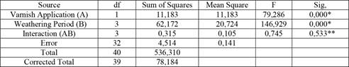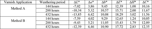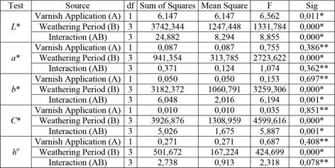 Table 2 shows the results of two-way analysis of variance for color parameters with varnish application and weathering fixed factors. Results show that interaction between both factors is significant for almost all the variables with the exception of a* color tone. Consequently, once there was a high significance level for the cross-effects (varnish application x weathering level), single effects must be evaluated. Nevertheless, in relation to color parameters the obtained values for the different varnish application were not found significant, contrarily to the values obtained for weathering.