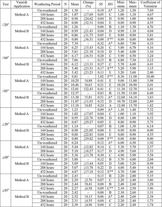 The minimum and maximum values, average and standard deviations were determined. A two-way analysis of variance was made, and homogeneity groups were determined with the data obtained before and after weathering of both varnish applications for glossiness, color and adhesion strength using the SPSS program (Sun Microsystems, Inc., 4150 Network Circle, Santa Clara, CA, USA).
