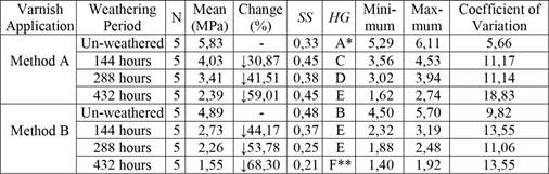 Two-way analysis of variance for adhesion strength with varnish application and weathering fixed factors is presented in Table 7. The interaction between both factors was likewise considered significant. Nevertheless, a significative value was obtained for the difference between the varnish applications and the weathering period for adhesion strength.