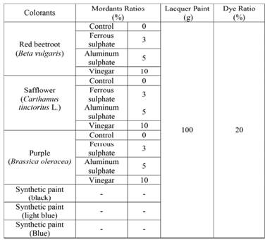 Application conditions of colorants and ratios are given in Table 1. Aqueous solutions were mordaned with 3 % ferrous sulphate, 5 % aluminum sulphate and 10 % grape vinegar to stabilize the color of extracted dyes, guarantee that they stuck to the applied substrate (to enhance retention quantity), and generate color options (Figure 1).