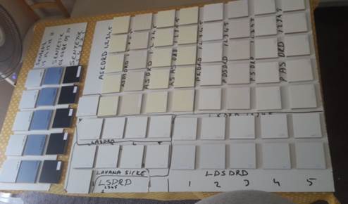 Obtained natural dye solutions and synthetic colorants were mixed with water-based lacquer paint. Then mordants were added to mixtures for final application on to MDF test samples. For the comparison of mordant efficiency, some MDF samples were coated with paint that was without mordants as control. Natural dyes and mordants mixtures have been added to water-based lacquer paint then applied to MDF test samples by air pressure spray gun (Figure 2).