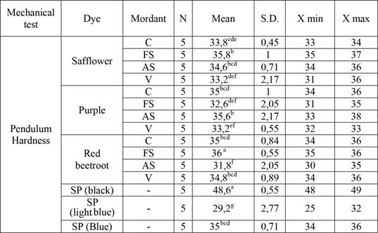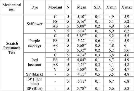 The descriptive statistical values of the scratch resistance of natural colorants, synthetic colorants and mordants that were applied on MDF panels are given in Table 2.