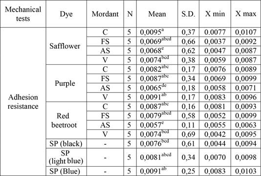 The mean, adhesion resistance test values of specimens that were colored by three types of synthetic paints and natural dyes and mordant mixes are shown in Table 4.
