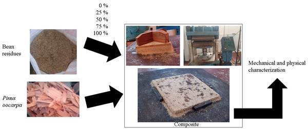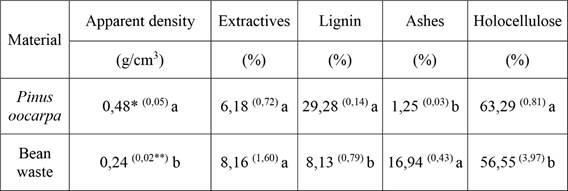 According to the results of the characterization of the particles "in natura", from bean residues, compared to Pinus oocarpa wood, density values were lower and the lignin, holocellulose, and the extractives content presented higher values.