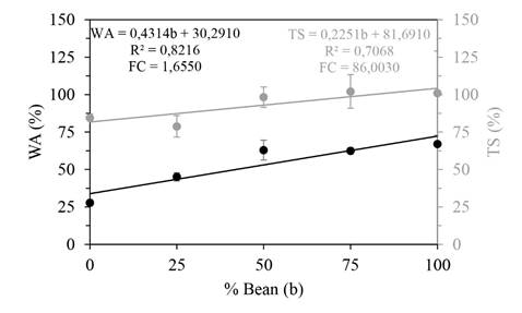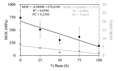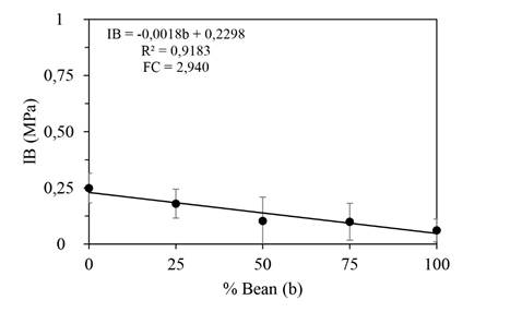 Regarding normative documents, ANSI A208.1-99 (1999) recommends that low-density particleboards must present minimum values for MOE, MOR, and IB of 550 MPa, 3 MPa and 0,14 MPa respectively. By replacing these values in the linear regressions generated in Figures 4 and 5, it is observed that the maximum value of bean residues to be added to the panel to comply with the standard is 24,22 % for the MOE, 57,02 % for the MOR, and 49,88 % for IB.