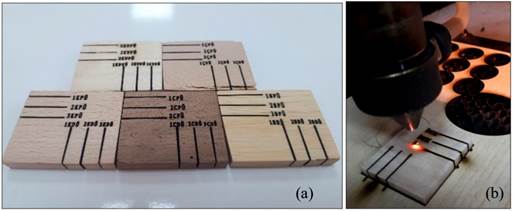 A total of 5 different tree species were used in the study. The densities of wood species in the air-dry state at 12 % moisture level are 657 kg/m³ in beech (Fagus silvatica L.), 595 kg/m³ in walnut (Juglans nigra), 557 kg/m³ in bamboo (Bambusoideae), 533 kg/m³ in sycamore (Platanus orientalis) and poplar (Populus Spp.) as 384 kg/m³. Experimental samples were prepared in the dimensions of 6 mm x 30 mm x 30 mm. Measurements were taken from different points by making cuts in the same test sample 3 times in parallel and vertical directions to the fibers. Experimental samples are shown in Figure 1a below, and laser cutting positions are shown in Figure 1b. In the study, a 10,6 µm wavelength CNC laser processing machine with a 130 W carbon dioxide gas cylinder, water cooled, 1,5 mm nozzle diameter, 2 mm thick and 20 mm diameter focusing lens was used. In addition, an optical microscope was used to determine kerf widths and measurements of heat affected zones. The materials were treated with 80 grit sandpaper and brought to the same surface roughness.