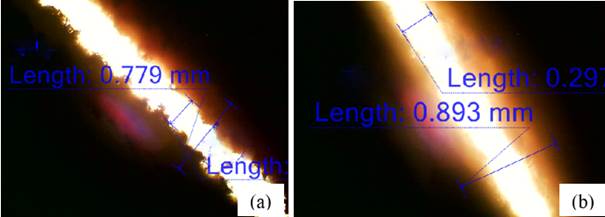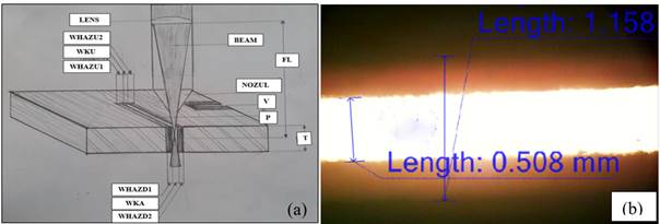 In the study, the limitations in machine processing functions and the thickness of the samples to be cut were taken into account. It is aimed to work only on material parameters by applying 80 % irradiation and cutting with 10 mm/s speed in a CNC laser machine with 130 W CO2 gas cylinder. Due to the function of the lens used for the cutting process, the beam focusing distance of 2 inches (50,8 mm) is focused in the middle of the thickness of the test sample to be cut. To determine the cut quality of the test sample, the upper kerf width (WKU), the lower kerf width (WKD), the width of the upper heat affected zone (WHAZU), the width of the lower heat affected zone (WHAZD), focusing length (FL), cut parallel to the fibers (P), cut vertical to the fibers (V) and test sample thickness (T) are shown in Figure 2a below. and the measurements of the samples with an optical microscope are shown in Figure 2b.