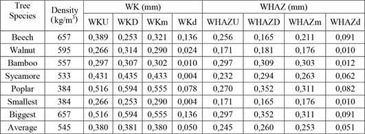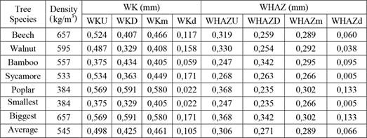 Upper kerf width (WKU), lower kerf width (WKD), average of upper and lower kerf widths (WKm), difference of upper and lower kerf widths (WKd), heat affected upper zone width (WHAZU) obtained by laser cutting wood samples parallel to the fibers, lower heat affected zone width (WHAZD), mean upper and lower heat affected zone widths (WHAZm), difference between upper and lower heat affected zone widths (WHAZd), together with the densities of the materials are shown in Table 1 below.