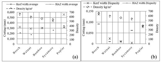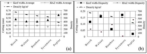 In laser cutting of wood species parallel to the fibers, bamboo solid species gave the best quality cut in terms of kerf smallness (narrow), while poplar solid species gave the lowest quality cut with 30,1 % more kerf width than bamboo. In terms of the difference or equality (geometry) of the lower and upper kerf, the poplar massif gave the best quality result with the smallest value, while the sycamore massif gave the lowest quality result with a 29,1 % larger value than the poplar. In laser cutting of wood species parallel to the fibers, in terms of the mean heat affected zone (HAZ) width, the solid sycamore species gave the best quality cut, while the poplar solid species gave the lowest quality cut with 11,9% higher than the sycamore tree. In terms of lower and upper HAZ difference or equality, the solid sycamore species gave the best quality cut, while the poplar solid species gave the lowest quality cut with 96,2 % greater value than the sycamore tree.