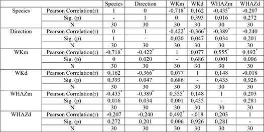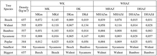 As seen in Table 4 above, according to the results of the correlation analysis, no significant relationship was found between wood species and cutting directions in laser cutting of tree species. Negative and significantly high correlation was obtained between the mean kerf width (WKm) and the wood species. The wood species variable affected the change in laser kerf width by 52 % (r2=0,515). In other words, as the density of the wood species increased, quality results with narrower kerf width were obtained compared to the statistical results. No significant results were obtained in the kerf width difference (WKd), which is important for wood species and cutting geometry. Negative and significantly moderate relationship was obtained between the mean of heat affected area (WHAZm) and wood species. The wood species variable affected the change in laser HAZ width by 19 % (r2=0,189). In other words, as the density of the wood species increased, quality results with narrower HAZ width were obtained compared to the statistical results. No significant results were obtained in the heat affected zone width difference (WHAZd), which is important for wood species and cutting geometry.