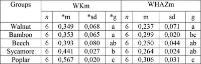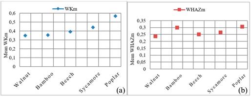 According to Table 5 above, there was no significant difference between walnut, bamboo and beech groups, as well as beech and plane tree groups in laser cutting depending on the mean kerf width (WKm) of wood species. The poplar massif formed a different group from all other wood species. There was no significant difference between walnut, beech and sycamore groups, between beech, sycamore and bamboo groups, and between sycamore, bamboo and beech groups in laser cutting depending on the heat affected zone width averages (WHAZm) of wood species. It is seen that the density properties are effective in group formation of wood species depending on kerf width averages (WKm). Since there are two groups parallel and vertical to the fibers in the direction of laser cutting, analysis of variance was not performed. The interaction graph of the laser cut kerf width of wood species groups, which gave meaningful results in the analysis, is given in Figure 6a, and the interaction graph of the laser cut HAZ width of the wood species groups is given in Figure 6b below. There is a parallelism between the kerf width trend of wood species groups and the HAZ width trends. However, this parallelism does not apply to the bamboo massif.
