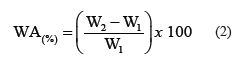 Where; W1 and W2 are the weight of the boards before and after test, T2 is the thickness of boards at any given time during water soaked condition and T1 is the initial thickness of the boards.