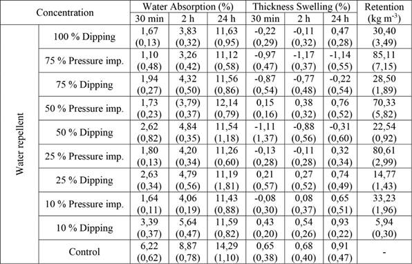 Treatment of composites with water repellent provided better dimensional stability of composites than that of untreated (control) groups.
