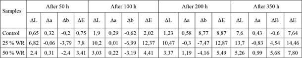 After the 350-h process, the highest color change was observed at the panel group impregnated with 25 % of WR (ΔE: 14,46) while the lowest color change was determined at the group treated with 50 % of WR among the treatment groups. The reason for higher color change for WR groups than control groups could be due to destroying and washing out the coating layer on composite surface, formed by WR treatment. Water absorption results was also showed that this surface layer protected composites against water absorption but with increasing immersion time, composites treated with WR absorbed water, indicates destroying this layer.