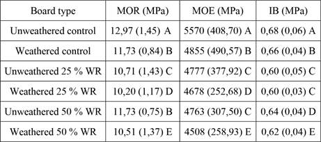 Treated and untreated wood-cement composites were exposed 350 h to an accelerated weathering test. Mechanical properties including modulus of rupture (MOR), modulus of elasticity (MOE) and internal bonding (IB) of unexposed and exposed to QUV were determined. The results of MOR, MOE, and IB of experimental boards including homogeneity group (Duncan test) values are given in Table 3.
