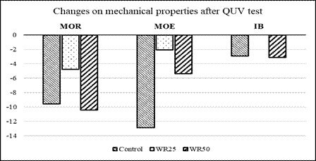According to results, all wood-cement composites tested in this study provide the minimum MOR and MOE requirement of the CEN EN 634-2 (2007) standard. In addition, the minimum requirements of IB strength in the CEN EN 634-2 (2007) standards are 0,5 MPa for general usage and 0,3 MPa after the cyclic test. Therefore, all types of board met the minimum IB requirement of the EN standards. Changes on the mechanical properties after QUV test are shown in Figure 1.
