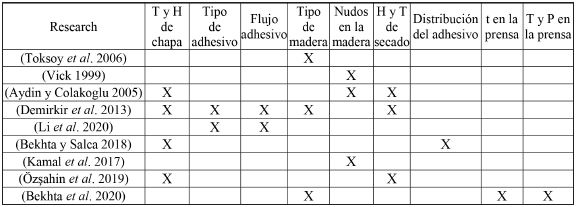 Distintos estudios realizados a lo largo del tiempo en la industria de contrachapados no han considerado el proceso productivo completo. Esto se debe principalmente a la variabilidad de la madera, por tratarse de un material de origen biológico lo cual juega un rol esencial. Asimismo, la cantidad de variables y parámetros a tener en cuenta durante el proceso confirman la complejidad a controlar. En la Tabla 1, se presenta una revisión sobre las variables de proceso que inciden en la calidad de un tablero contrachapado, que se han concentrado en determinar las condiciones óptimas de operación.