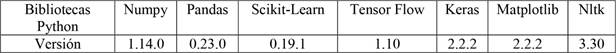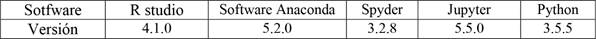 Para la elaboración de los algoritmos analizados en esta investigación se utilizaron los lenguajes de programación recomendados para el análisis de datos y ML, Python y R (Manrique 2020), Adicionalmente se utilizó el software Anaconda, puesto que cuenta con los editores de código Jupyter y Spyder. Las versiones de los programas y bibliotecas con sus versiones utilizadas se mencionan en la Tabla 3 y Tabla 4 respectivamente.