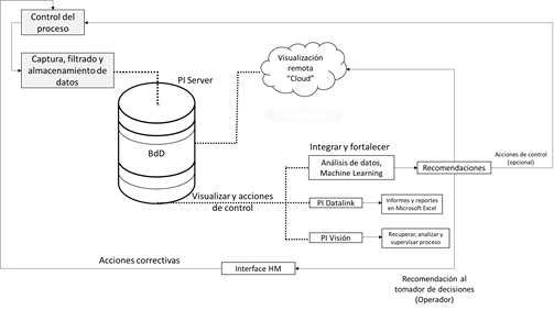 Los registros de las variables en línea fueron capturados por la plataforma PISystem®. La Figura 2 muestra la arquitectura de la captura y disponibilidad de datos. Se trata de una planta de tableros contrachapados ubicada en Chile, que produce un volumen superior a 300000 m3/año de tableros de Pinus Radiata.