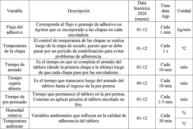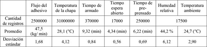 Como se observa en las Tabla 5 y Tabla 6, las variables de proceso fueron capturadas en distintos intervalos de tiempo, por lo que se tuvo una gran variabilidad en la cantidad de registros. Los únicos datos capturados fuera de línea corresponden a la resistencia adhesiva o tracción perpendicular. Estos registros de control de calidad se realizaban por medio de ensayos físico-mecánicos bajo la norma EN-314 (2007). La estructura de estos datos se caracteriza por el tipo de encoladora, turnos, número de la chapa del tablero donde fue tomada la muestra, espesor del tablero y tipo de uso (interior o exterior) según adhesivo aplicado.