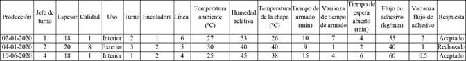 Para cada variable e intervalo de tiempo de la Tabla 5, se calculó un valor promedio representativo que es registrado en el data set preliminar antes del pre procesamiento. Por su parte, los datos de ensayos de adherencia provenientes del laboratorio (datos capturados fuera de línea), que corresponden a la variable respuesta, fueron asignados al registro correspondiente por fecha de producción. Se realizó bajo los criterios de aceptación del valor de adherencia (criterio de aceptación: tablero utilizado para interiores ≥ 80 % y exteriores ≥ 85 %), se adicionó en la columna respuesta si el tablero fabricado en la fecha de producción fue aceptado o rechazado.