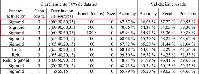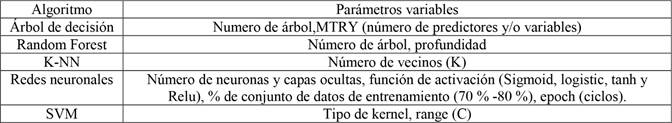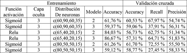 Las Redes Neuronales se implementaron en Python, variando los parámetros que se mencionan en la Tabla 8. Se probaron distintas combinaciones en un mismo modelo. La optimización se realizó bajo el algoritmo Adam.