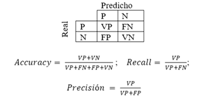 Donde, VP: Verdaderos positivos, FN: falsos negativos, FP: falsos positivos, VN: verdaderos negativos, accuracy: proporción de predicciones correctas en relación con el total, recall: proporción de casos que el algoritmo identifico como valores positivos, precisión: proporción de casos que el modelo predijo correctamente los valores positivos.