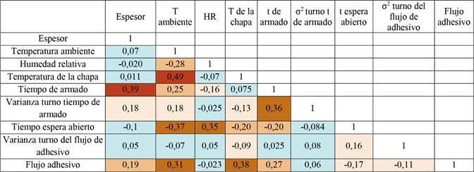 Del análisis se obtuvo una mayor correlación entre la temperatura ambiente y la temperatura de la chapa con un valor de 0,49, seguido del tiempo de armado con el espesor del tablero contrachapado, con un valor de 0,39, lo que es razonable y acorde a lo expuesto por Demirkir et al. (2013) y Zavala y Valdivia (2004). Sin embargo, las correlaciones no son lo suficientemente altas (mayores a 0,8) como para disminuir variables del data set.