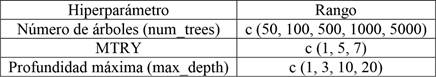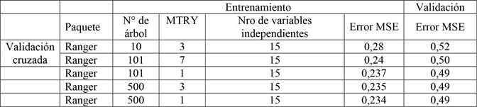 Mediante validación cruzada se realizó un barrido por la cantidad de árboles incluidos en el modelo. El parámetro MTRY es el número de predictores y/o variables que se seleccionan en cada división del árbol, con el fin de encontrar los parámetros óptimos, tanto para el ajuste del modelo como para la capacidad de predicción del algoritmo, obteniendo que a partir de una cantidad de 100 árboles y un MTRY igual a 3 el error se mantuvo constante. Como el análisis individual de los parámetros del modelo puede ignorar combinaciones óptimas, se realizó la búsqueda grid search para los parámetros mencionados en la Tabla 10.