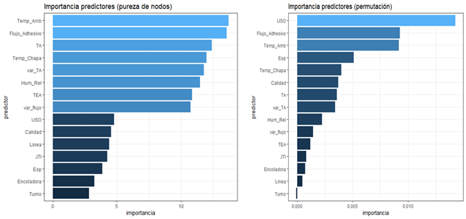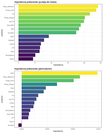 Para efectos de analisis posteriores, se determinó la importancia de las variables seleccionadas en la predicción de la adherencia del tablero, es decir, cuales de ellas tiene una mayor influencia en la calidad del producto. Dicho análisis, se relizó a través de la pureza de los nodos y empleando la técnica de permutación (Figura 5), coincidiendo con Demirkir et al. 2013 y Li et al. 2020 en que las variables más influyentes en la calidad del tablero (adherencia) fueron: el flujo de adhesivo que se adiciona en la etapa de encolado y la temperatura ambiente.