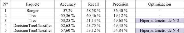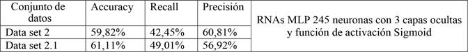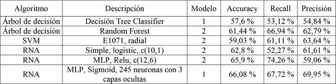 Se ha concluido en diversos estudios que las redes neuronales tienen mejores rendimientos predictivos cuando se tienen múltiples variables que describen la variable respuesta (Curteanu y Cartwright 2011, Demirkir et al. 2013, Miguel et al. 2018). Lo anterior se debe a que presentan parámetros que se pueden variar para obtener mejores métricas de rendimientos, como los que se evaluaron en este estudio: función de activación, cantidad de neuronas, capas ocultas, entre otros. Ello concuerda con lo observado en la Tabla 23 donde se obtuvieron los mejores resultados para RNAs de tipo MLP con una predicción correcta de un 66,08 %.