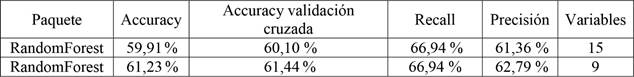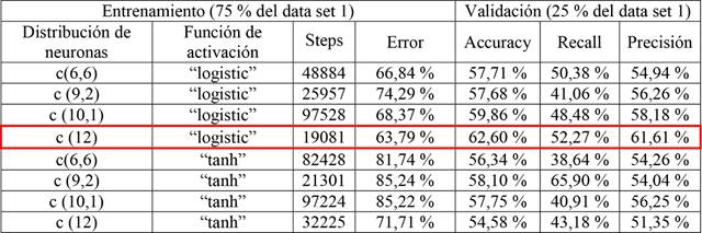 De las RNA evaluadas se obtuvo un mejor rendimiento con la función de activación logistic tanto para los modelos 1 y 2. Al disminuir las variables de entrada (modelo 2) se obtuvo un accuracy de 63 % en la validación. Sin embargo, existe un error en el entrenamiento de aproximadamente 64 % a diferencia de utilizar el modelo 1 (todas las variables seleccionadas), donde el error de entrenamiento disminuye a un 47 % con métricas similares a la validación.