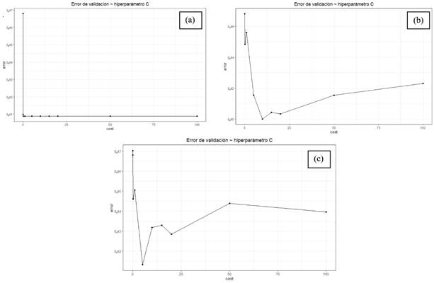 Para el algoritmo SVM de clasificación se modificó el tipo de kernel y el hiperparámetro C. Este último se optimizó a través de grid search (Figura 8). El kernel lineal entregó el mejor valor de C, el cual es igual a 0,1 (Figura 8a), ya que el error en la validación del algoritmo se vuelve contante, basta con utilizar ese valor para evitar costos computacionales innecesarios. Para el kernel radial y polinomial, se visualizó una mayor sensibilidad al cambio del valor de C (Figura 8b, Figura 8c). Dentro de los rangos evaluados se encontró que los mejores valores para el parámetro C en kernel radial es 10 y para polinomial es 5. Se realizaron réplicas del modelo variando estos parámetros para confirmar lo expuesto por la búsqueda grid search (Tabla 14).