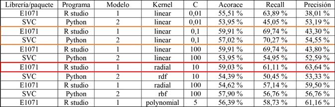 En la Tabla 14 se observa que la optimización del hiperparámetro es adecuado para cada kernel. Además, que independientemente del número de variables seleccionadas y el tipo de kernel, se obtienen resultados similares con eficiencias aproximadas a 59 %.