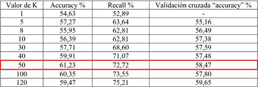 Se observa en la Tabla 15 las corridas del modelo N °2 en un amplio rango del valor de K desde 1 a 120, obteniendo las mejores métricas para accuracy y recall con un K igual a 50. Adicionalmente, no se encontró una diferencia significativa en la capacidad predictora en comparación con los demás algoritmos evaluados anteriormente, ya que al igual que SVM se obtiene un accuracy cercano al 60%. Sin, embargo, se obtuvieron mejores resultados para la métrica recall, es decir, se identificoo con mayor exactitud los tableros aceptados.