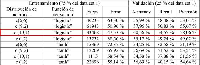 Las RNAs simples se evaluaron en el programa R studio, variando la cantidad de variables de entrada, el número de neuronas y la función de activación (logistic y tangencial). Los análisis se realizaron con ayuda de la librería neuralnet. Para los modelos1 y 2, se presentan estos resultados en la Tabla 16 y Tabla 17 respectivamente. Se realizaron 10 réplicas.