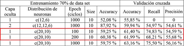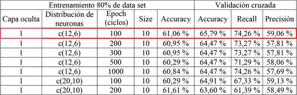 En la Tabla 19 se realizaron corridas con las mismas instancias expuestas en la Tabla 18 (número de neuronas y epochs (ciclos), pero con distinta proporción del data set para entrenamiento y validación, 70 % y 30 % respectivamente. Se obtuvo una predicción correcta de 59 % a 63 %, siendo similar a lo obtenido por la partición del data set en 80 % de entrenamiento y 20% de validación (Tabla 18), obteniendo predicciones correctas de aproximadamente 65 %. Con relación al accuracy de la etapa de entrenamiento no se presentaron diferencias al disminuir la cantidad de registros, puesto que se mantuvo en 59 % a 60 % para ambos casos.