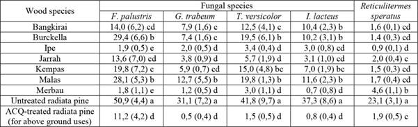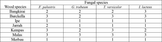 Natural durability to wood decay fungi was classified according to EN 350-1 1994. The decay index (x) was calculated for the species tested using radiata pine sapwood as the reference species. Wood species were classified as very durable (x ≤ 0,15), durable (0,15 < x ≤ 0,30), moderately durable (0,30 < x ≤ 0,60), slightly durable (0,60 < x ≤ 0,90), or not durable (x > 0,90). The durability class of the wood species against each decay fungus tested is presented in Table 2. Ipe, Jarrah, and Merbau were classified as very durable, except for Jarrah which was classified as durable against F. palustris. Jarrah's unusually weak resistance to F. palustris may be explained as reported by Hastrup et al. (2005), where F. palustris, a well-known copper-tolerant fungus, is far more aggressive than other fungi tested. F. palustris may also be better at metabolizing wood in the presence of Jarrah’s extractives than other fungi. Bangkirai, Burckella, and Kempas were rated moderately durable to durable depending on test fungi in this study. Malas was shown to be moderately durable after exposure to all fungi tested.