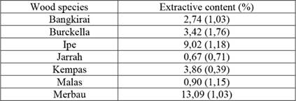 The natural durability of the heartwood of some wood species against fungal and termites attack is thought to be due to the presence of various extractives in the wood (Hillis 1987, Scheffrahn 1991). This is especially true in tropical hardwood species because there is no frost all year round to keep pest populations down (Beal et al. 1974). Several studies carried out to investigate the natural durability of hardwoods tested in this study to fungal attacks (Clark 1969, Osborne 1970, Amemiya and Matsuoka 1979, Yamamoto and Hong 1989, Yamamoto and Momohara 2002, Miller et al. 2003, Morrell 2011). For some wood species, studies have also been on the types of extractives responsible for their natural durability (Hillis and Carle 1962, Romagnoli et al. 2013). Grace et al. (1998), Suzuki (2004), Grace and Tome (2005), Arango et al. (2006), and Morrell (2011) found that hardwoods tested in this study have strong resistance to termite feeding. Many researchers have reported the correlation between extractive content and termite resistance in naturally termite-resistant wood species (Little et al. 2010, Kadir and Hale 2012, Kirker et al. 2013, Mankowski et al. 2016, Hassan et al. 2017, Hassan et al. 2018, Hassan et al. 2019, Kadir and Hassan 2020).