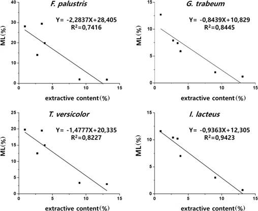 Several factors such as the amount and chemistry of extractives, wood density, growth characteristics, and hemicellulose and lignin content, have been used to explain the natural durability of wood species (Zabel and Morrell 1992, Eaton and Hale 1993). It appears that the primary factor affecting durability is the type and amount of extractive compounds found in the heartwood (Hillis 1971). The durability of heartwood is greatly affected by differences in preservative qualities of the wood extractives (Zabel and Morrell 1992, Eaton and Hale 1993). The relationship between the total extractive content summarized in Table 3 and ML % shows that the greater the total extractive content of the species, the smaller the ML % , i.e., greater durability regardless of test fungi. The correlation coefficient (R2) of this relationship ranges from 0,42 for T. versicolor to 0,57 for F. palustris. If Jarrah, which has a low extractive content compared to excellent decay resistance, is excluded, the correlation between extractive content and ML % is significantly improved for the remaining six species. The relationship between extract content and ML % was excellent in the order of I. lacteus (R2 = 0,94), G. trabeum (R2 = 0,84), T. versicolor (R2 = 0,82), and F. palustris (R2 = 0,74), as shown in Figure 1. Despite low extractive content, Jarrah is thought to have excellent decay resistance because the extractives responsible for the durability of Jarrah might not be extracted with the ethanol-toluene solvent. Ipe heartwood contains high levels of lapachol that was shown to be a fungi toxicant (Romagnoli et al. 2013). The durability of Jarrah heartwood is likely attributed to methanol-soluble catechin and gallic acid (Hillis and Carle 1962). From the research results that the ML% of unextracted and methanol-extracted merbau samples by T. versicolor was 3,8 % and 42,5% respectively (Yamamoto and Hong 1989), it can be inferred that methanol extractives of merbau impart natural durability to wood. Robinetin, the main polyphenol of the heartwood of merbau extracted using methanol solvent, is believed to be responsible for its natural durability (Hillis and Yazaki 1973). Even though density has been shown to correlate with decay resistance in previous studies (Takahashi and Kishima 1973, Wong et al. 1983), no significant correlation between density and ML % was found in this study, possibly due to narrow range (0,72 g/cm3 to 1,01 g/cm3) of the density of seven test species.