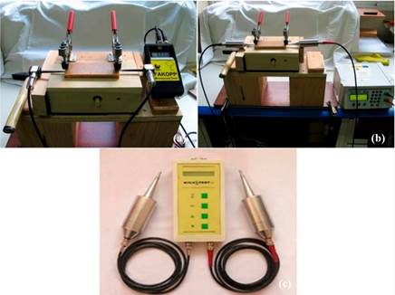 To conduct the acoustic tests, three commercial devices were used: USLab, Sylvatest-Duo, and Fakopp Microsecond Timer, manufactured by Agricef, CBS-CBT, and Fakopp Enterprise, respectively (Figure 1). The first two measure the velocity of ultrasonic wave propagation in the evaluated specimens. USLab operates at a frequency of 45 kHz and the Sylvatest-Duo at 22 kHz. The third device measures the stress wave velocity generated by a hammer strike on the start sensor, which is received at the end sensor. The pulse used is at a lower frequency than with ultrasound and is generally lower than 20 kHz (Dackermann et al. 2014). For the ultrasonic and stress wave tests the specimens were placed on wooden supports and held by a horizontal clamp.