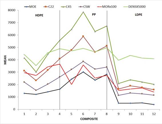 Table 3 shows the mean values of the specimen properties by composite type. Properties varied among composites, mainly due to the type of matrix (polymer) used. In addition, the inclusion of voids in the molding process interfered with the density of some specimens. Specimens made with HDPE presented the greatest number of voids, except for formulation 4 which reached a density of 980 kg·m-3.