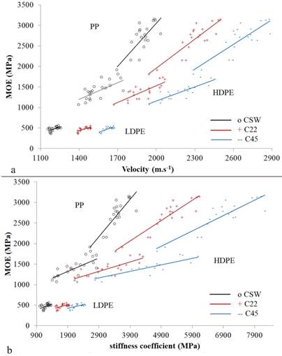 For HDPE and PP, the coefficient of determination was greater and the estimated standard error was lower when the stiffness coefficient was used instead of wave velocity. However, the reverse was true for LDPE. Regarding the types of waves used, for HDPE and LDPE the best results were obtained with the 45 kHz ultrasonic waves, while for PP it was with the 22 kHz ultrasonic wave.